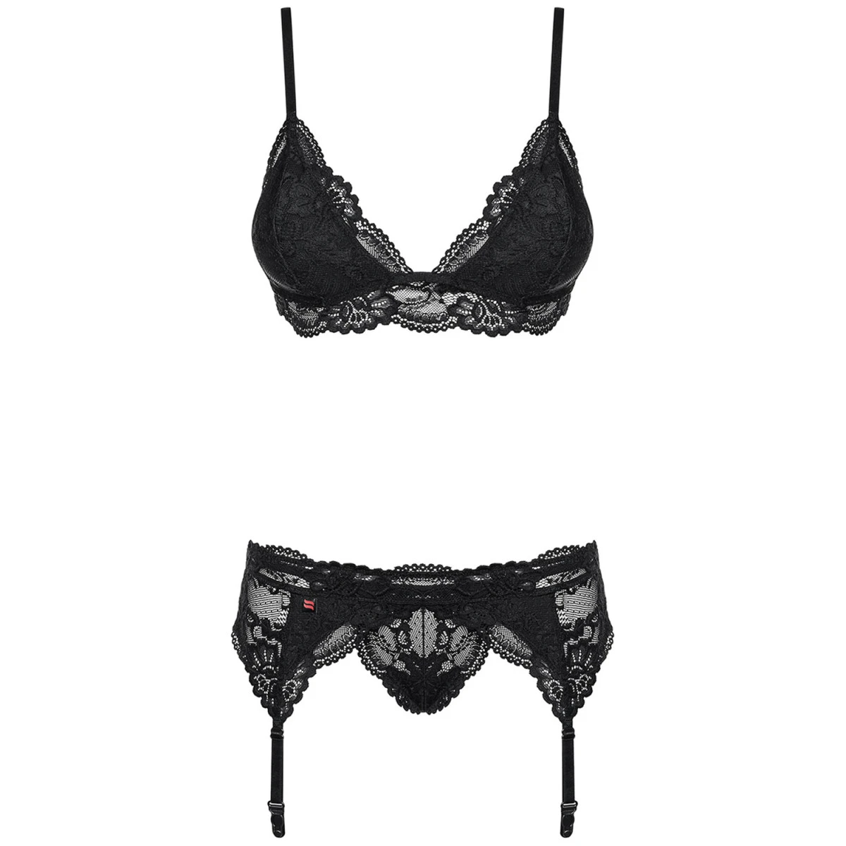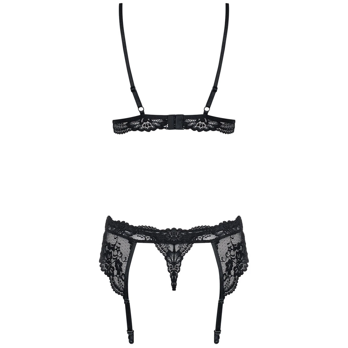 Deze zwarte kanten jarretelset van Obsessive zal de temperatuur zelfs in de koudste klimaten verhogen. Verwen jezelf en je partner met het stomend hete uitzicht van jou in deze verleidelijke zwarte kanten bh en string.