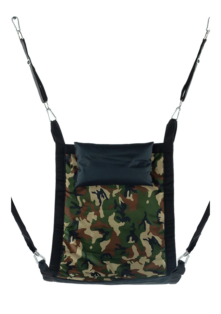 Rectangular canvas sling – 4 points – Full set – Camo – Hier is een camo stof sling met alle accessoires: de hangers met de metalen karabijnhaken / de gewatteerde voetsteunen (11cm breed) / het kussen (23 x 38cm). De sling is rechthoekig van vorm. Materiaal: polyester. Met de opbergtas