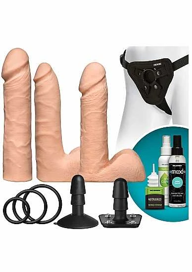 Your perfect strap-on experience is on lock with Doc Johnson?s deluxe line of full-service Vac-U-Lock Harness Sets. The Vac-U-Lock Dual Density ULTRASKYN Set is a solid investment for upgrading or beginning your strap-on accessories collection offering multiple options in one box via a complete harness with removable o-rings and plug three ULTRASKYN attachments and a bottle of Mood water-based lube. These lifelike dual density attachments?an 8 Realistic Dong a 7 Cock and the bestselling 7 Slim Cock– warm to body temperature with use and feature a soft pliable exterior that gives way to a firm inner core recreating the feel of a real erect penis. Attachments can be used with the harness the included Vac-U-Lock suction cup and any other accessory or harness in the line. The Vac-U-Lock Dual Density Starter Set also includes Doc Johnson Natural Toy Cleaner and ULTRASKYN Refresh Powder to properly and hygienically maintain your dual density ULTRASKYN attachments. Every product in the patented Vac-U-Lock system is designed to help you create any strap-on or toy you?re in the mood for and it?s as simple as popping on the attachment of your choice.